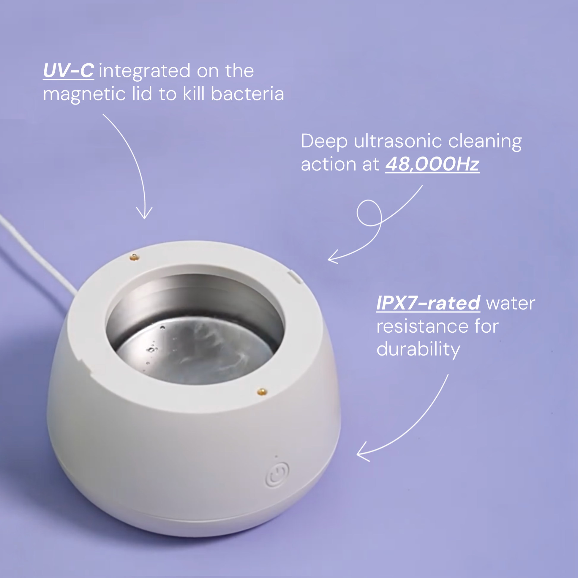 Ultrasonic engine at 48,000Hz. Integrated UV-C lamps. Sealed IPX7 water-resistant design. Built for dependable, everyday use.